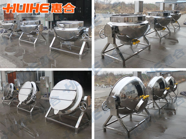 可傾式夾層鍋主要由鍋體和可傾架組成;鍋體是由內外球形鍋體組成的雙層結構形式,中間夾層加入導熱油或水。