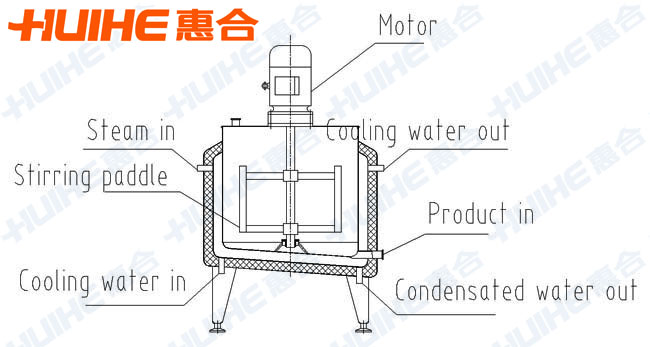 Jacket: the A3 or 1Cr18Ni9Ti steel plate, strengthen circle spiral device, the cold water from bottom to top (without pressure), to achieve the best heating and cooling purposes.