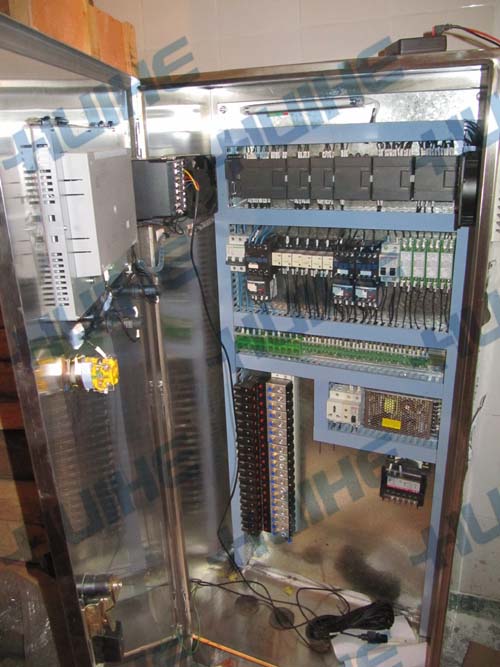 下圖為該全自動CIP清洗系統的控制柜內部構造及PLC顯示屏的運行界面。